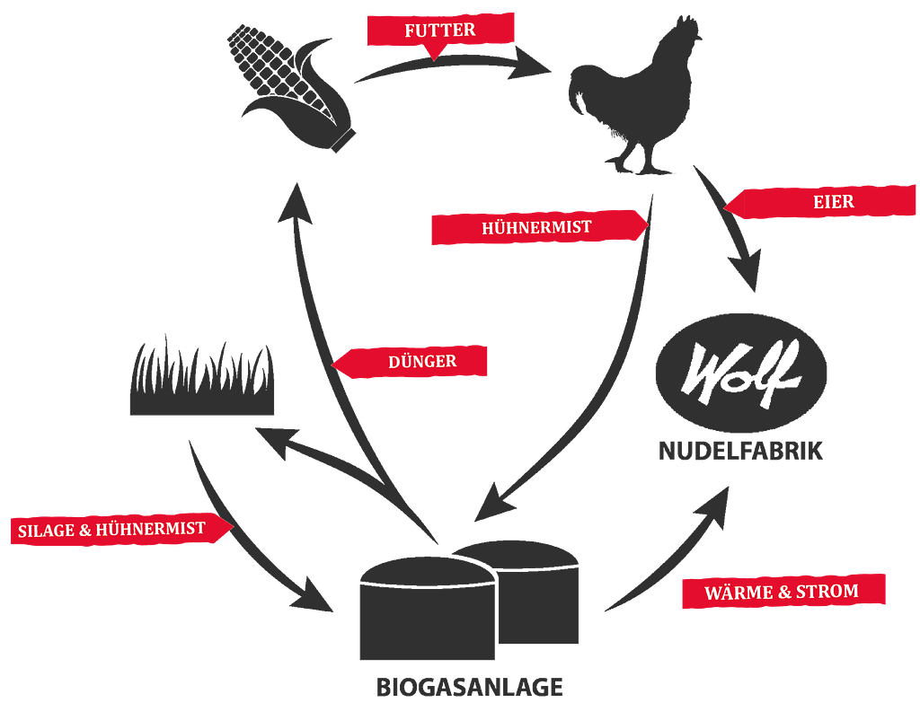 Mit dem entstehenden Methangas wird Grün-Strom erzeugt. Die Abwärme wird für die Nudeltrocknung genutzt. Der Überschuss wird in das Stromnetz eingespeist.